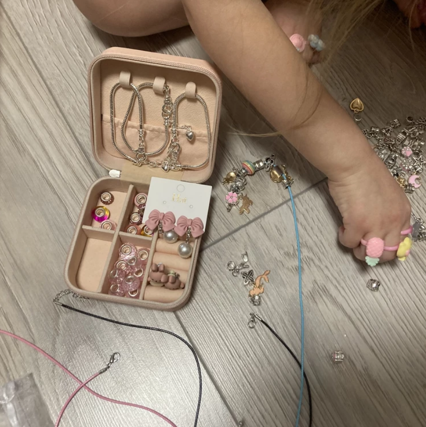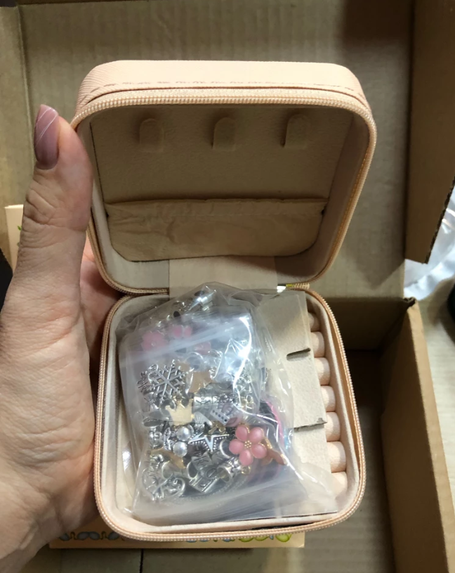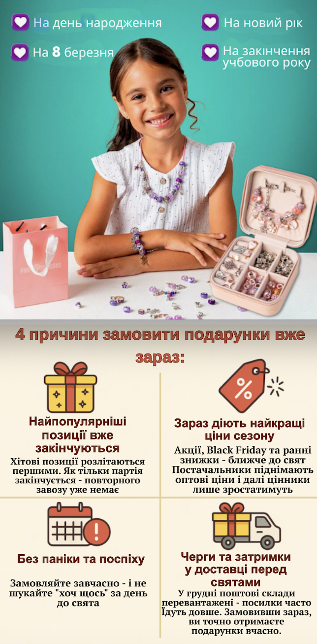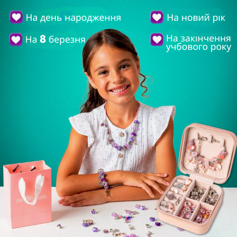 Набір просто приголомшливий, моя дочка в захваті! За таку ціну, ну дуже крута річ, навіть подарунковий пакет є плюс футляр для зберігання готових прикрас. Дуже подобається те, що можна змінювати на мій смак елементи, підвіски.
